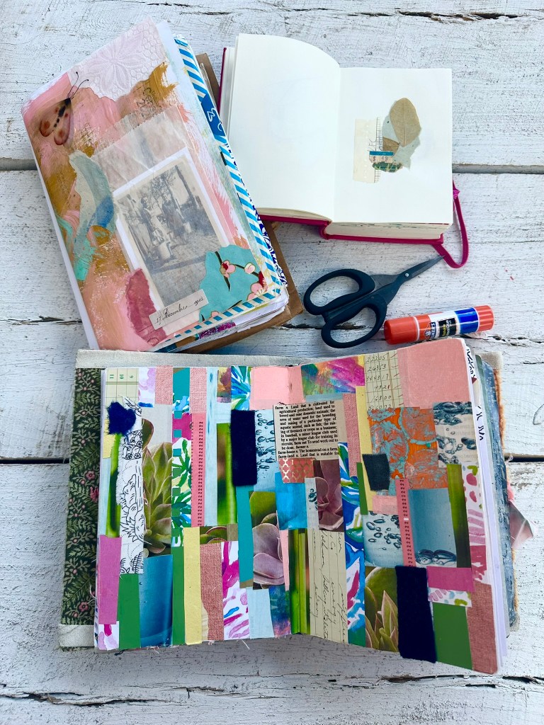 Sketchbooks and journals are great for art journaling, but the blank white page can also be intimidating. Vintage books, novels, cookbooks and childrenโs books can also be used for art journaling and provide a variety of paper options, inspiring graphics and illustrations, and come in a variety of shapes and sizes.